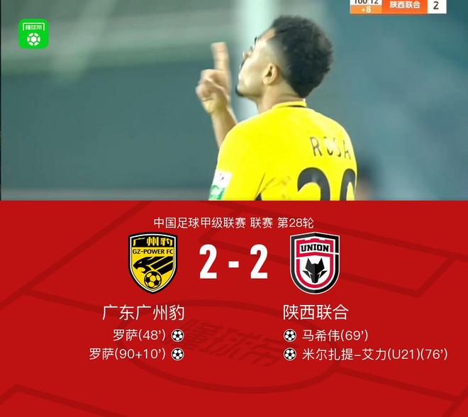 北京时间10月26日,中国足球联赛第28轮比赛中,广东广州豹队主场迎战陕西联队。下半场,广东广州豹罗莎取得领先,马希伟追平比分。替补出场的米尔扎蒂·艾里进球,陕西联队取得领先。罗莎在补时阶段打进扳平比分的进球。最终比分 广东广州豹2-2陕西联 重要比赛第48分钟,夏大龙顶住后卫反击,罗莎禁区射门破门。广州豹队1-0领先。当阿兹拉克横传球门时,马希伟从相反角度抽射破门。第76分钟,陕西联队将比分追成1-1。唐凯元助攻,米尔扎蒂推射破门,陕西联队2-1领先。罗莎在补时第90+10分钟进球。广州豹队主场2-2战平陕西联队。亮点:两队球员均上场。 10分钟后比赛中,陕西联队试图防守,但因越位被判出局。第17分钟,项影边路传中,裁判判罚点球。第21分钟,尼康禁区外任意球破门。反映后被门将没收。第28分钟,罗莎中路传中。继续带球后,他禁区前的射门被挡出。第35分钟,阿利克蒂禁区外尝试远射,但皮球没有进入球门。第45分钟和第1分钟,阿卜杜勒瓦哈普与邓飚发生争执,导致对抗。第48分钟,夏大龙顶住后卫反击,罗莎禁区前补射破门。广州豹队1-0领先。阿兹拉克传中,马希伟扳平比分。对方角度射门,陕西联队将比分扳成1-1。第76分钟,王牌球员唐凯元上场,米尔扎蒂的射门破门,为陕西U队双方2-1领先。第88分钟,吹响裁判哨子的米尔扎蒂起脚,被韩轩推倒在地。罗莎在补时第90+10分钟打进扳平比分的进球,广州豹队主场2-2战平陕西联队。陕西联队技术统计 跑动