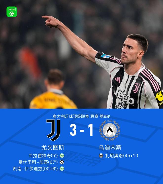 北京时间10月30日,意大利足球甲级联赛第9轮,尤文图斯主场迎战乌迪内斯。布拉霍维奇上半场进球,随后自己主罚点球。补时阶段,扎尼奥洛禁区内突破射门。下半场,加蒂接坎比亚索传球头球再次取得领先。耶尔迪兹在补时阶段进球并亲自主罚点球锁定胜局。最终,尤文图斯3-1击败乌迪内斯,结束八连胜。布拉霍维奇在决定性比赛的第五分钟进球,并亲自主罚点球。尤文图斯1-0乌迪内斯。第45分钟和第2分钟,扎尼奥洛禁区内调整射门。乌迪内斯1-1尤文图斯。第67分钟,坎比亚索传球,加蒂头球破门,尤文2-1乌迪内斯。耶尔迪兹在第90分钟和第6分钟分别进球,随后亲自主罚点球,帮助尤文图斯3-1战胜乌迪内斯。在聚会中,两队的球员都参加了。比赛立即开始伊利。第16分钟,布拉霍维奇进球,但助攻他的麦肯尼被判越位,进球被判无效。第37分钟,乌迪内斯做出改变。基南·戴维斯受伤。巴克瑟出现了。第38分钟,科斯蒂奇接球远射过奥科耶。第39分钟,布拉乔维奇突入禁区射门,但皮球被奥科耶挡出。第41分钟,布拉霍维奇禁区前射门,但皮球被奥科耶挡出。第48分钟,戈里切头球破门,但皮球被迪格雷戈里奥扑出。第61分钟,奥蓬达传球被挡,射门被奥科耶挡出。第64分钟,弗拉霍维奇禁区前射门,皮球飞入边网。第69分钟,耶尔迪兹突入禁区射门,但皮球被奥科耶挡出。第78分钟,耶尔迪兹插上射门,皮球从门框上弹起。第89分钟,巴约赫尝试头球攻门,但皮球稍稍偏出。第 90+9 分钟,大卫进入禁区并以一定角度射门。但皮球被奥科耶拦住。球队阵容技术统计