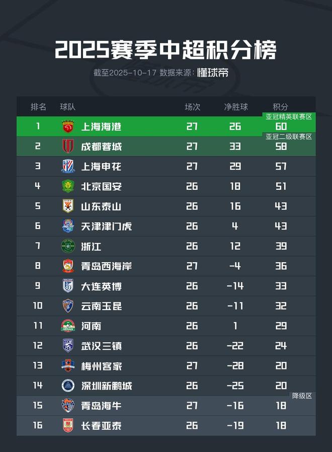 北京时间10月17日,中超联赛第27轮第1轮结束。联赛前三的海港、成都和申花分别击败了各自的对手。本轮比赛,上海港客场4-3战胜青岛海宇,成都凭借杨明阳、莱斯特、罗慕洛的进球战胜梅州客家,上海申花客场2-1战胜青岛西海岸。目前,三队积分差距仅3分,联赛还剩3场,争冠形势仍悬而未决。中超联赛前三名上海港(60分)剩余赛程为10月21日上海港对阵町田泽维尔(亚冠精英)、10月26日山东泰山对阵上海港(中超)、10月31日上海港对阵浙江(中超)、11月4日武里南联对阵上海港(亚冠精英)、11月22日大连英博对阵上海港(亚冠精英)。 上海港(中超)11月25日 上海港vs首尔FC(亚冠精英) 12月9日 新山vs上海港(亚冠精英) 成都荣成(58分) 日期 10月21日 成都荣成vs新山(亚冠精英) 10月26日 青岛西海岸vs成都荣成(中超) 10月31日 成都 成都vs河南(中超) 联赛) 11月4日 首尔FC vs 成都 成都(亚冠精英联赛) 11月22日 深圳西鹏城 vs 成都 成都(中超) 11月25日 成都 成都 vs 广岛三箭(亚冠精英) 12月9日 神户胜利船 vs 成都 成都(亚冠精英) 上海 申花(57分)赛程 10月22日 上海申花 vs 首尔FC(亚冠精英) 10月26日 上海申花 vs 大连英博(中超) 10月31日 上海申花 vs 深圳联赛 精英) 12月10日 广岛三箭 vs 上海申花 申花(亚冠精英) 保级,梅州客家、青岛海牛未尝胜绩这一轮。本轮,深圳西鹏城将对阵北京国安,长春亚泰将对阵河南队。