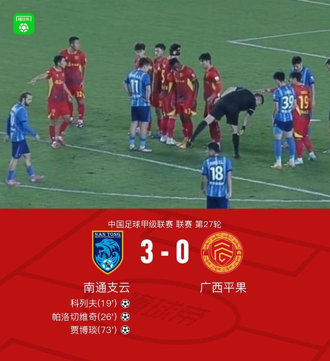 北京时间10月19日,2024年中国足球联赛第27轮比赛,南通支云主场迎战广西平果。比赛中,陈冰冰送出精准传球,帮助科列夫率先打破僵局。随后刘野进攻得手,帕洛切维奇回应得分,主队扩大领先优势。下半场,科列夫展现了进攻组织能力,在贾博扬的助攻下再下一城。最终,南通支云3-0击败广西平果,全取三分。关键事实:第19分钟,左路传球。科列夫停球,转身低射远角。南通支云1-0。第26分钟,刘野倒三角传球。帕洛切维奇进球扩大比分。第73分钟,南通支云2-0。科列夫左路传中,贾博阳头球再下一城。南通支云 3-0 伟大的时刻。本部分两队选手均参加。这场比赛大约是开始。第10分钟,陈冰冰外围射门。球被守门员挡住了。第19分钟,科列夫左翼传中后停球,转身远角低射。南通支云1-0。第26分钟,刘野倒三角传中。帕洛切维奇进球扩大比分。南通支云2-0。第52分钟,毛推倒楚夸缩小比分。第61分钟,科列夫向姚迪兰挥手。经过VAR审核后,主裁判判罚点球。第73分钟,科列夫左路接传球,贾博彦头球破门再下一城。南通支云3-0技术统计