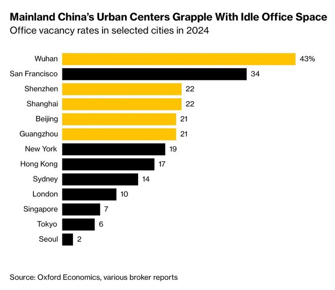 2024年主要城市写字楼空置率。武汉空置率全球最高,达43%,显着高于旧金山的34%。深圳、上海、北京和广州的空置率也很高,在21%至22%之间,几乎超过纽约(19%)和香港(17%)的水平。相比之下,东京和首尔分别只有6%和2%。事实上,中国的商业写字楼空置率正在飙升。这主要是由于CBD地区的增长放缓,以及过去十年大量新办公楼的竣工。然而,经济衰退和远程工作趋势导致公司削减租赁空间,导致空置建筑过剩。房地产顾问和经济学家预测,在复苏之前,还需要数年时间才能吸收商业建筑供应过剩的影响。行业研究报告显示,2023年至2024年,非生产性商业地产资产出售总额中国的交易额预计将达到1140亿元人民币(约合160亿美元),占去年总交易额的22%,创下历史记录。截至2020年的十年间,中国的写字楼开工数量比前十年增加了两倍多。 The Crest 过去15年,外国房地产买家在中国的办公楼、仓库、购物中心和数据中心投资了近1400亿美元。投资者认为他们将从企业对办公空间需求的长期增长中受益,但事实证明这是一个误判。史无前例的供应过剩导致了租金的下降。在上海,凯雷集团运营的韩国国民养老金服务基金于 2024 年底出售了一栋 31 层办公楼,价格仅略高于十年前出售价格 14.6 亿元人民币的一半。这座被称为“The Crest”的建筑已经上市一年多了。当凯雷集团于 2015 年收购该建筑时,商业l 租金上涨。根据莱坊研究部的数据,同年上海写字楼空置率为4.6%。据凯德中国信托称,为了防止仓库和其他物流设施空置,一些业主已主动将新租赁价格降低25%。凯德中国信托还在中国拥有购物中心和商业园区。房地产协会根据世邦魏理仕的数据,去年中国全国平均写字楼空置率达到25%,主要是由于供应增加。今年,这一失业率仍然很高。牛津经济研究院亚洲房地产经济服务主管尼古拉斯·威尔逊表示,该全球机构“认为市场短期内不太可能复苏”。他预计明年中国写字楼租金将继续下降,并预测2030年建筑物的面值将低于2020年。